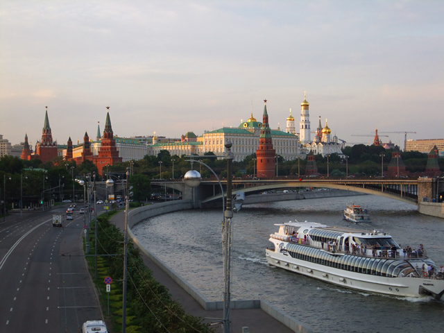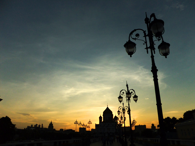 儘管心願已了,見夕陽霞光正麗,自然不捨離去,想了想,便踱上教堂另側橫跨莫斯科河的人行步橋。臨橋遠望,河水粼粼,曲折奔入「克里姆林宮」懷抱,那兒高塔參差、遊輪散點,由於方自其行出,感觸又比昨日更深了些。