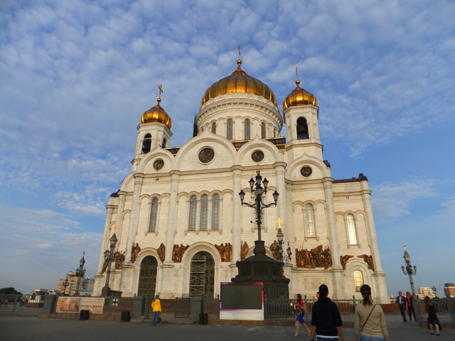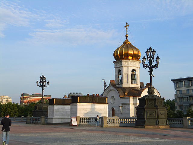 消磨過用餐時光,想當然爾便是依原先計劃溜出旅館再度搭上地鐵,與昨晚往「新少女修道院」的車途類似,綠線轉紅線,不過改在「Kropotkinskaya」站下車。出口離我的目標很近,不用找路人確認方向,隨便一瞥,便瞧見「救世主基督大教堂」金頂在天際閃耀。