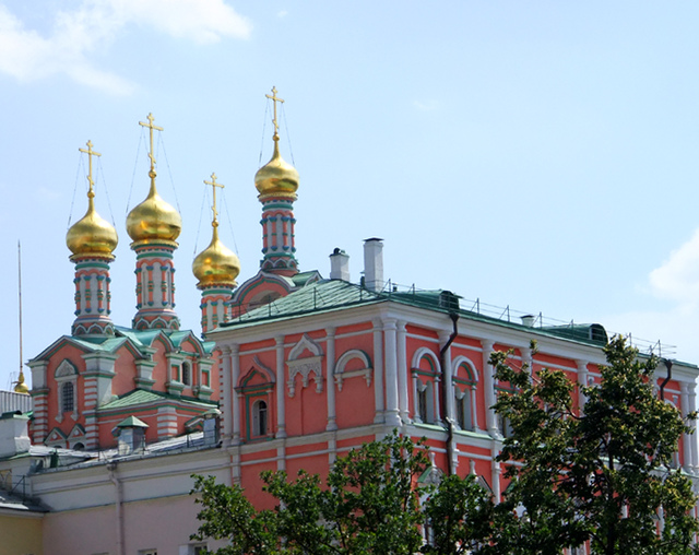 馬路對面是條長巷,巷內隱約可見一棟粉色門樓,亮麗之處在簷頂,摻上了雪白條柱勾框,添繪了青綠斑彩,接續竄升為三柱金冠。那兒是身為皇家劇院的「娛樂宮」(Amusement Palace),早年為「阿列克謝一世」賞賜給岳丈之居地,據說小巧樓閣裡居然還包納了花園與教堂,後者應就位在那瑰麗冠柱下與不遠鐘塔相互輝映吧。