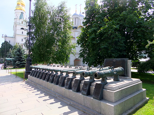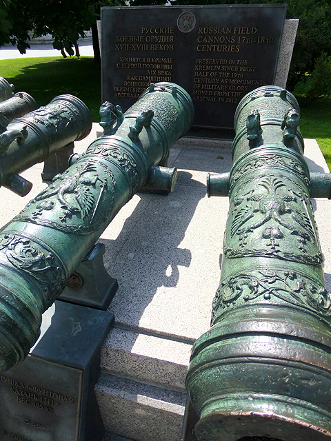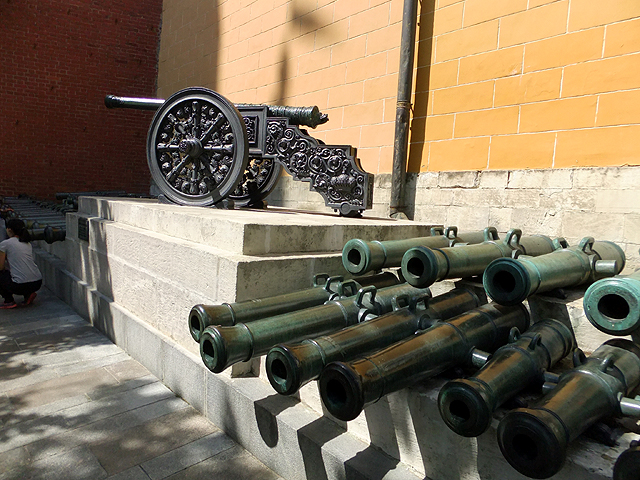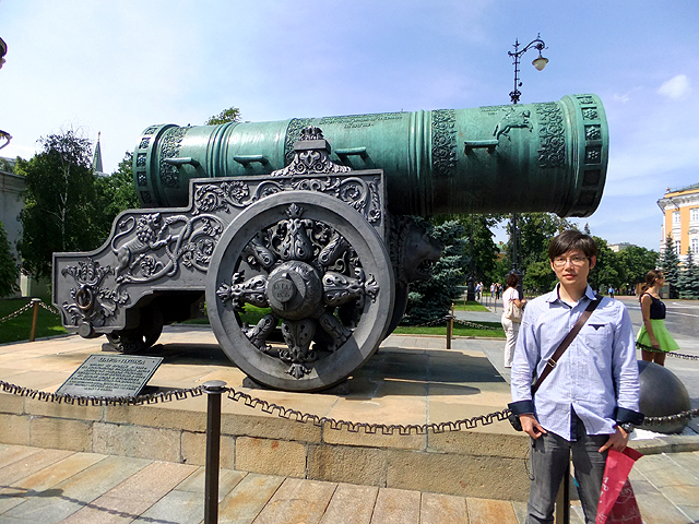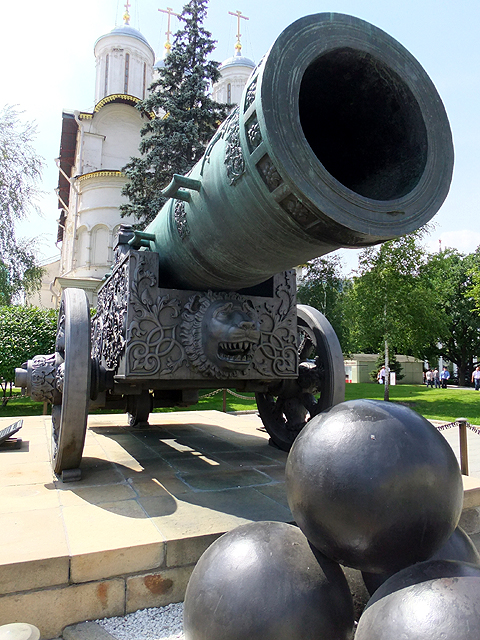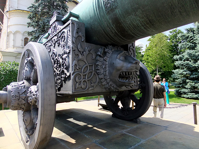 這座置於馬路邊的五公尺巨砲鑄造於十六世紀末,是個近四十公噸的龐然怪獸。不過原該兇面厲齒的兵器,卻被細細膩膩雕鑿出繁複刻花,管口處有「恐怖伊凡」兒子「費奧多爾一世」(Fyodor Ivanovich)的策馬浮刻,支座上纏藤勾捲,能見雄獅撕按邪蛇,輪輻則雕鏤含羞苞蕾,未綻卻已瑰麗。正面還特意拉探獅子怒顏骴牙以顯其威,但不知為何眉眼卻被我拍攝得驚恐,令人望之發噱。或許被塑造得過於精緻,上天也不忍讓它走上血腥道路,據說誕生之後未發過一砲,安安穩穩成了個觀覽展品至今。