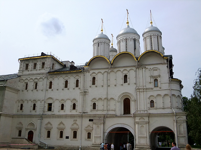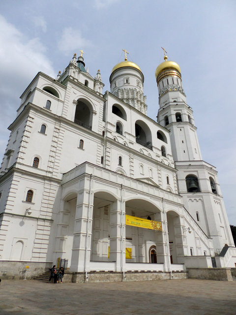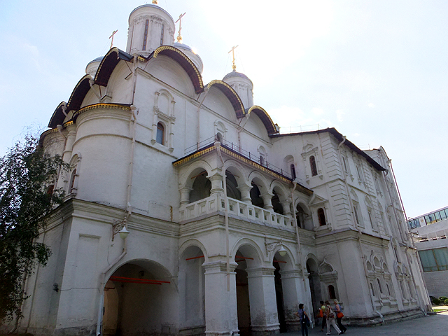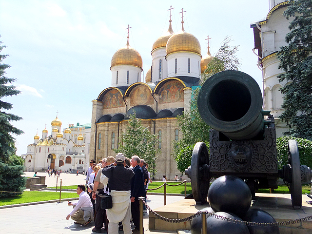 由資料圖片而觀,似乎內廳皆已失去原本彩繪,連聖像屏都是來自已被拆毀的「基督升天大教堂」(The Kremlin’s Ascension Cathedral),故而這兩棟現時已成了博物館,展示東正教相關祭器與貴族餐具。沒聽說一般旅遊團有安排入內,因此我也只能於堂外迅捷左右端看,飛速按著快門,然後順路旁雕花砲管展列,趕去團員所在的「砲王」(Tsar Cannon)處。
