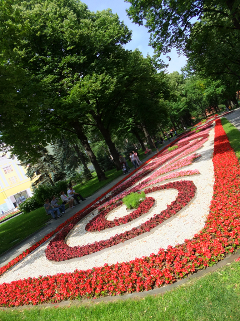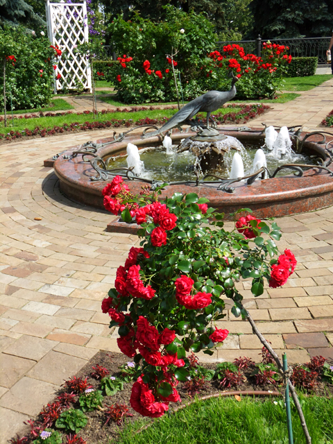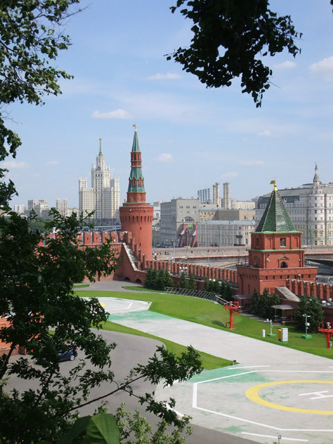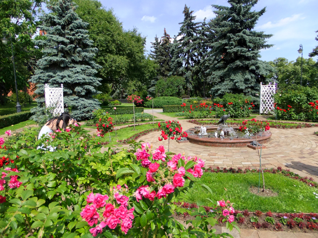 端詳須臾,以為接續便要轉入教堂廣場,導遊卻將我們領遠至馬路對面的小花園。猜測這兒應便是當年皇族閒憩走晃之處,雖比不上咱們老祖宗御花園的佔地廣大,假山綴湖,閣榭散點,至少也以現今花藝植漫得繽紛,在碧葉間交織柔黃火艷。循步徑走去,還有小池以銅雕孔雀為心,娟秀噴吐著湧泉。再往牆邊,另能見到直升機降落場,而在一座座磚紅尖塔之外,便是昨日曾悠緩盪過的「莫斯科河」。
