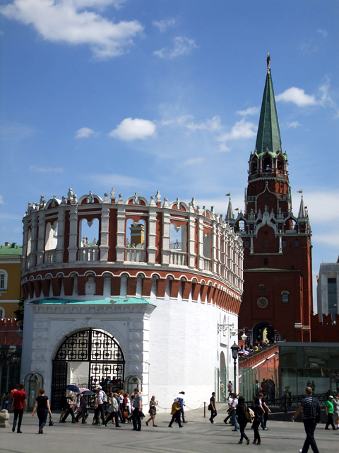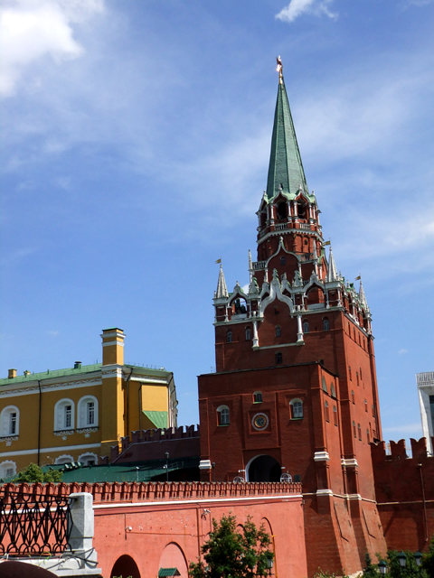 依著集合時間大夥聚攏,接續便是從特別設立的安管閘門站點,進入「庫塔非亞塔」後的「三聖橋」。橋旁矮牆堆砌成起伏雉堞,倒有點像循古時高跨護城河之長橋,一路通抵宮牆最高的「三聖塔」(Troitskaya Tower),而當跨過此門便是正式進入舊時皇城了。