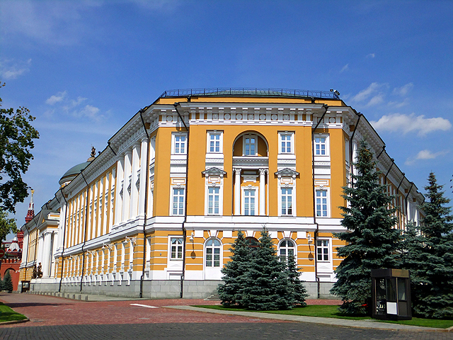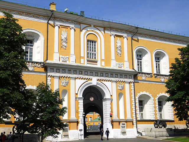 好在由此望向馬路對面「兵器館」隔鄰,倒沒再見到什麼傷眼景致,皆是一色淡黃古典建物以白色柱框勾飾,儘管門面沒有特出醒目雕琢,至少和諧舒泰。先望見的是「參議院」,於「紅場」瞥見的大拱頂隱隱約約在牆邊露點臉,這樓閣本因身處三角畸零地而結構尷尬,不過嵌了拱頂圓廳卻神來一筆令其穩稱起來。自列寧以降,此樓成了總統居住及辦公之處,猜測哪個遊客若漫不經心晃蕩過去,應就被立即射殺,不死也殘吧。