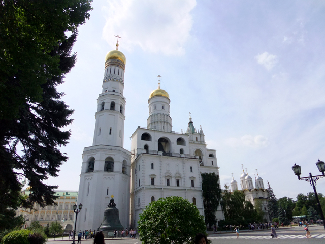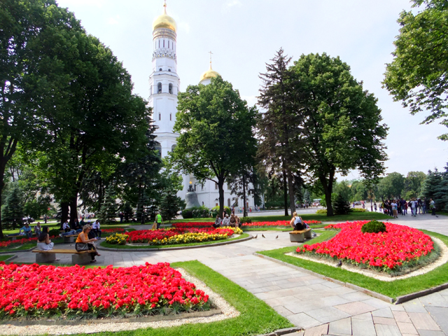 我們在花園處反身而望,「克里姆林宮」的制高點「伊凡鐘塔」(Ivan the Great Bell Tower)英武聳立,方才於「鐘王」處因過於接近無法盡覽,此時拉了點距離,剛好能端望其形姿。這座81公尺鐘塔因其名稱本以為又與「恐怖伊凡」有關,不過查了資料才知築建於其父「瓦西里三世」時代,這兒原先有座教堂「St. Ivan Climacus Church」,但在「克里姆林宮」重新翻修中被拆除改建為鐘塔,搭襯周遭幾座大教堂,也獻給上任大公「伊凡三世」。