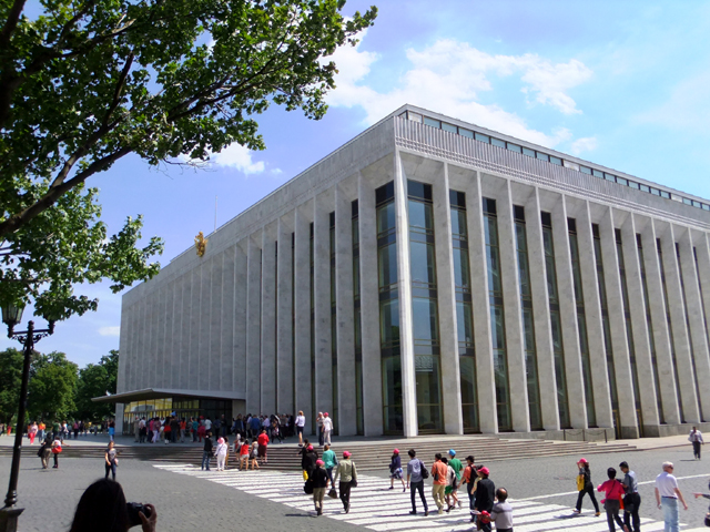 穿過馬路,我們在巷口再次停佇,望著一棟與「兵器館」相對的龐大建築。它方方整整,以條柱嵌著玻璃帷幕,現代的冷峻風格與周遭古典宮城反差甚大,望來突兀。導遊說這是蘇聯時期砌建的「國家會議廳」(The State Kremlin Palace),包含高達八百之數的房間群與開闊的音樂表演廳。其英文名稱雖竊用「克里姆林皇宮」之炫詞為自己添彩,但總覺根本名不符實,那破壞景觀的不協調樣貌著實惱人。
