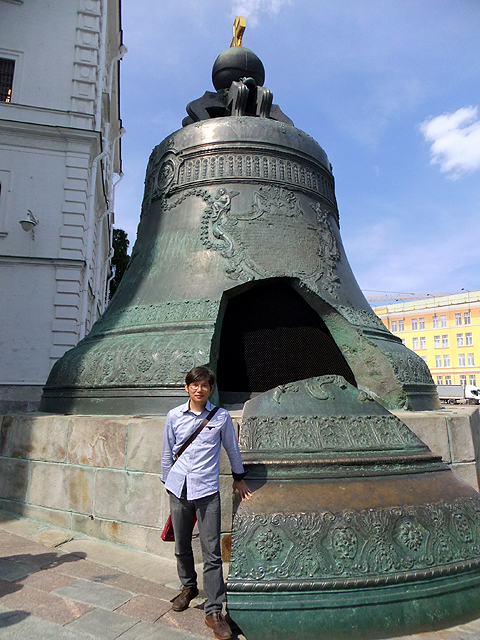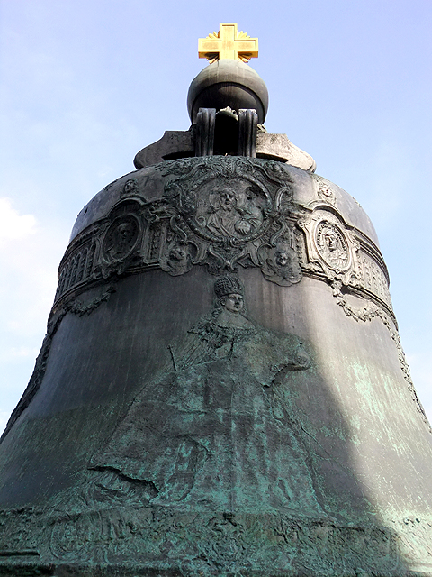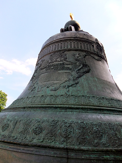 這有六公尺高的巨鐘號稱世界最大,卻因毀了容、啞了音被棄於鑄坑百年餘,直到近代才憑一身歷史蝕傷鹹魚翻身,成了「克里姆林宮」觀覽焦點之一。我走近它身邊,頂緣還存著以耶穌為首的聖經人物帶飾,鐘面大片銘文妝點,同時也細膩刻出「安娜女皇」與「阿列克謝一世」容姿,儘管有著污毀,仍能見其精心雕工。崩落的板片亦在一旁靠立,供遊人憑弔,還有淘氣稚童矮身探首,好奇著鐘內殘跡。