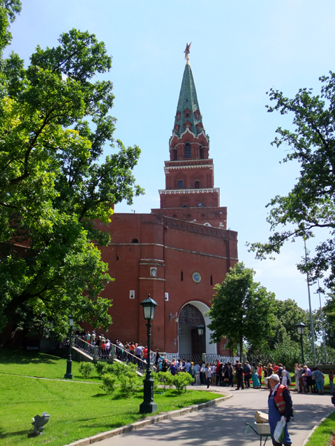 「克里姆林宮」的遊客入口在低矮綴冠的「庫塔非亞塔」(Kutafya Tower),由於提早過來還沒到預約時間,大夥便隨意在附近的「亞歷山大花園」南段閒晃。此處相較早上待過的北端上花園平淡許多,就僅是舒泰林道。不過一路走到最尾的「博羅維奇塔」(Borovitskaya Tower),那兒門外的排隊人龍卻長得讓我驚詫。