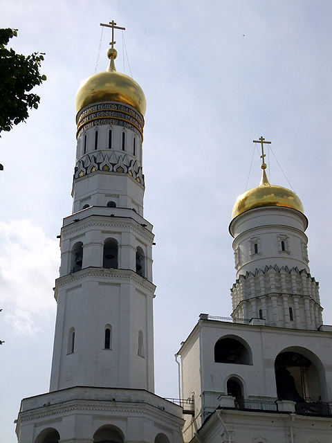 它底層是厚重的八角樓柱,往上分作三段層層縮減。與周遭一式的刷白牆色素雅,僅以拱窗攜著波紋刻綴作妝點,不過隨著高度攀昇,它燦點起金色銘文環帶,與輝亮塔冠睥睨整座宮城。而鐘塔並非孤傲一座,還有兩個相似建物依伴著迭降。次高者稱作「聖母升天鐘塔」(Assumption Belfry),有較闊的方樓立面與相似塔冠。再一旁是由「費拉瑞主教」規劃的附屬建築「Filaret Annex」,不知是何因由,不合群地改以青白交綴的錯落尖頂呈現反差風貌。