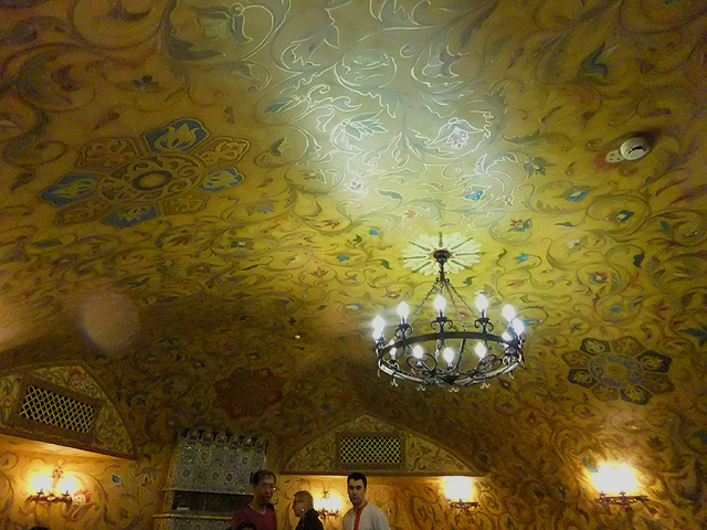 一路隨導遊鑽進「紅場」邊建築,但在窄弄與階梯幾番轉繞,隊伍竟因拉得過長而頭尾失散了,驚慌狐疑中,幸好還有領隊快步追上,將我們這群走過頭的後隊拎了回去。餐廳很有民俗風味,門柱與門拱漆上斑斕彩紋,環套似地一重重疊砌而起,廳內也成交連拱頂,在澄亮底色細碎繪著撩目團花。導遊說此店是亞美尼亞風格,也為我們備上招牌麵包湯,捏成碗盅的麵包外皮烤得酥脆,頂部劃切為碗蓋,掀了起來,內裡便是微鹹中帶點甘韻的蘑菇濃湯。