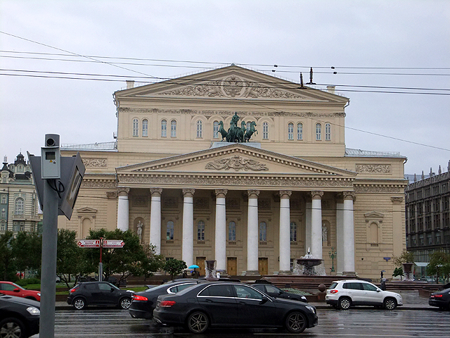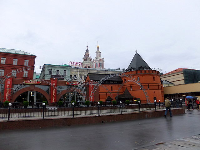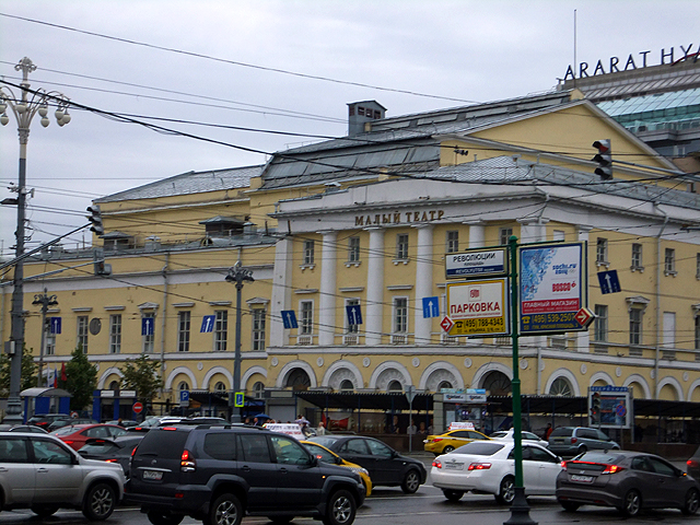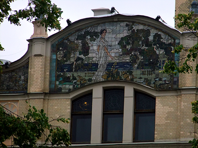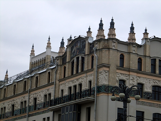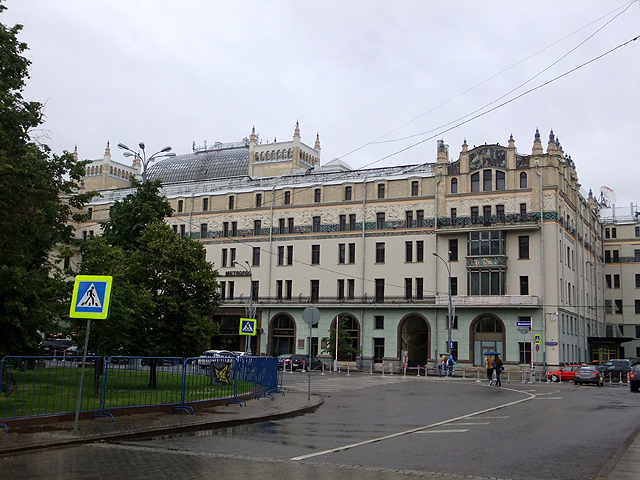 餐廳臨近「紅場」北側,可是重重建築擋掩,不現一絲廣場風貌,反而因在地鐵「劇院站」上方,讓我先望見古典樣式的「大劇院」,它工工整整,頂簷山牆下加添柱廊與三角楣,以紋飾內點、銅雕外妝,只惜一路見多了皇宮,這樣的制式自然激不起驚喜。而旁邊「小劇院」嫩黃為底、雪白柱拱疏淡幾筆勾畫,若非特別留意,更可能以為是哪棟商家民居了。倒是馬路對面「大都會飯店」比較吸睛,中段拉出長帶人像浮刻與彩磚,頂部則用塔錐添飾,並於曲緣下綴以華美馬賽克圖繪,不知夜晚打上光暈會否更有另種風姿。