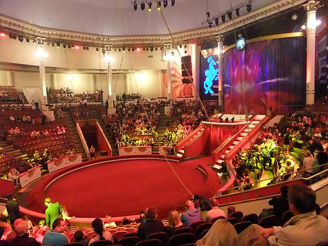 不過今日倒非就此飲湯嚼米悠哉收尾,俄羅斯以馬戲團聞名全球,自然得去見識一番。本以為會如想像中是高架交連帳篷立於空廣處,沒想到在街區便下了車,導遊手一指,稱路邊那混於民宅的樓房便是。根據燈牌,我們來訪的是由「尼庫林」創始、歷史悠久的「老馬戲團」,回去查了一下,似乎莫斯科還有另處同樣著名的「大馬戲團」,其樣式才為一般概念。