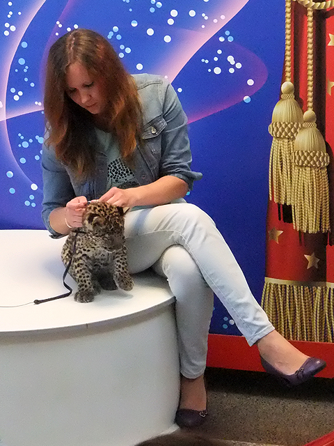 不過中場的猛獸合影只是新秀初試啼聲,當下半場樂聲響起,才是團裡大牌明星們接續亮相。在炫亮華裝的男士與身姿婀娜的女子引導下,一眾虎豹優雅跨步出場立於柱座,之後隨著鞭影誘使,各自翻滾蹦躍。