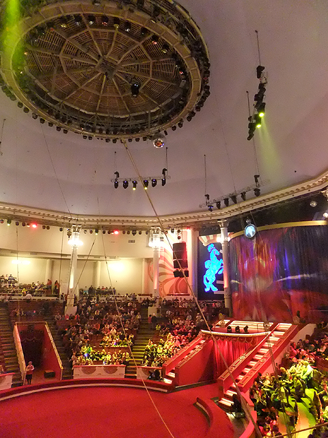 雖說建築外觀不甚壯觀醒目,其實裡面倒也有著小劇院容量,階梯狀的環形座位疊降,環擁著艷紅舞台,不見什麼烘托故事的華麗景片佈置,看來應就僅單純技藝表演了。