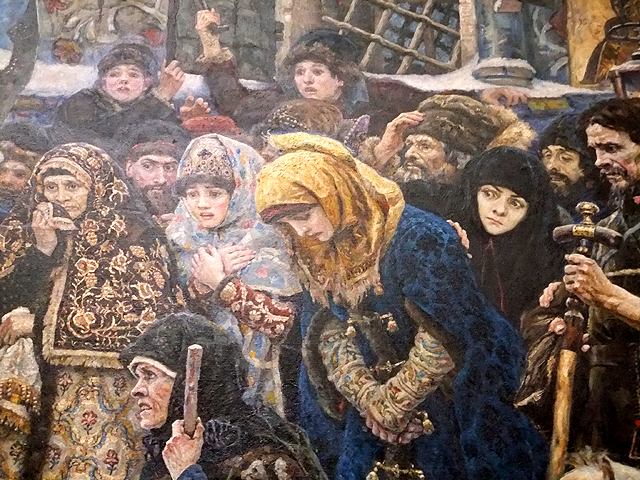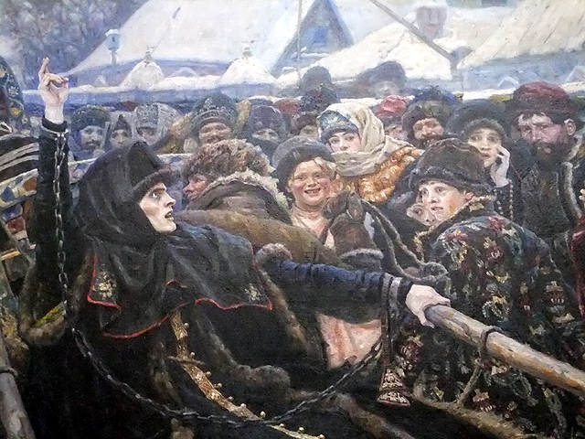 此幅「Boyarina Morozova」其實講的也是宗教分裂引發的慘劇,這女子因身為「Old Believers」一員而被判關囚至死,畫中被鎖置囚車的她一身黑衣躺仰望天,右手依舊高舉,以代表十字架的交錯兩指陳述不變信念。而場中民眾卻是各樣人情冷暖,反對一派獰笑嘲弄,支持一方卻是驚詫、悲嘆、默禱,為其命運祈福。