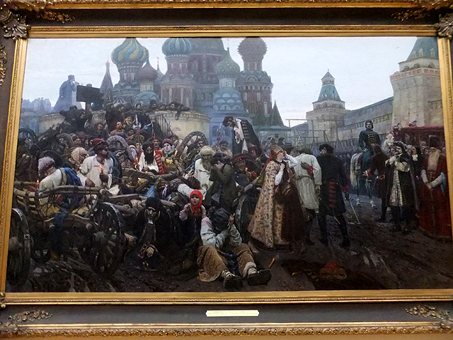 最後導遊停佇在「Morning of the Execution of the Streltsy」,那是一場對叛亂火槍兵的集體處決,畫家拉近「聖巴索教堂」與「克里姆林宮」之距以增強張力,可以望見牆邊騎馬鶴立官員間的「彼得大帝」,他面色鐵青,瞪視著場中雜擠民眾。我無法分辨那些呼喊婦孺是否僅是不捨泣別,抑或也被視為亂黨將被同誅。但那散漫場中的悲怒與怨懟卻隨堆疊人群不斷奔繞而後凝聚,形成一股沉滯的壓迫氛圍。