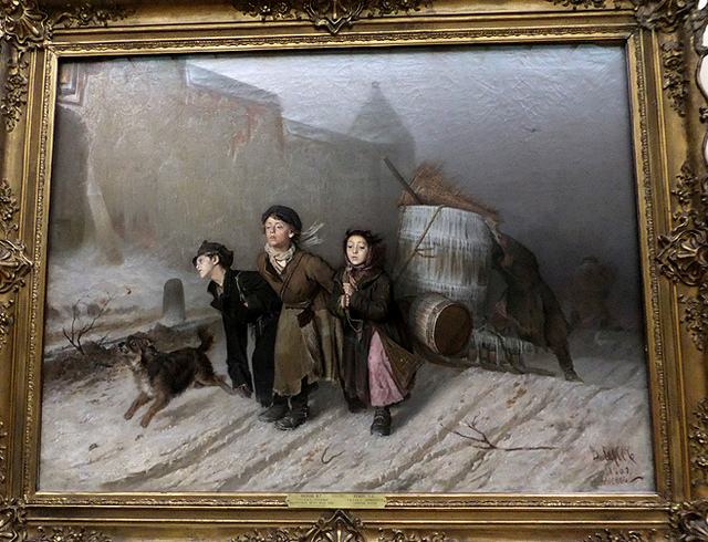 寒涼的景畫不僅於此,「Apprentice Workmen Carrying Water」點繪著凜冬街頭,三位單薄衣衫的孩童迎著飛雪拖拉水車,憔悴臉顏及木然眼神深刻透出對未來的空茫。或許人生的無奈無所不在,出沒於戰場,也綁縛在小市民生活,儘管不願、掙扎,亦只能於遇上時留下一聲輕嘆。