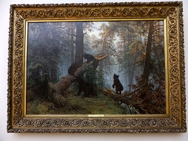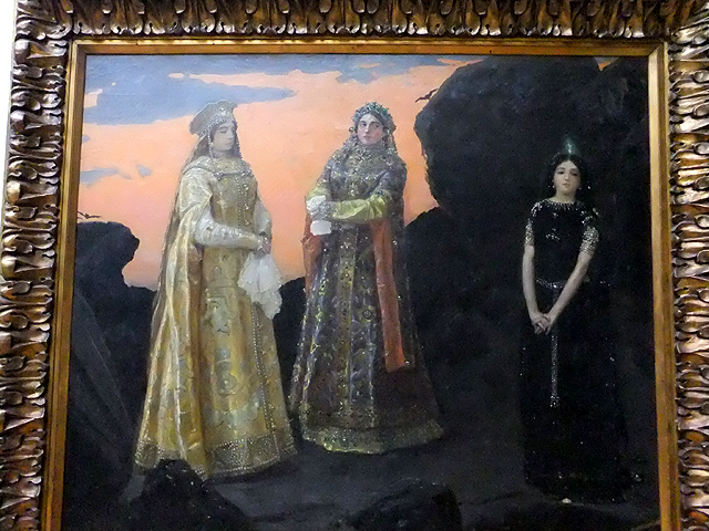 在導遊的飛速帶領中,我瞥過恬靜森林裡嘻玩的小熊,月夜下優雅斜倚的女郎,但一幅「Three Czarevnas of Underground Kingdom」卻勾著我多停留片刻。它將俄羅斯童話「金、銀、銅國」改編為地底國度,用三姐妹代表黃金、寶石與煤礦。象徵人性貪婪的兩位姊姊衣衫炫亮華麗,卻傲冷鄙視退避石影的可愛小妹,然小妹黑袍相比之下儘管樸素,代表的卻是燃燒自己所帶來的溫暖與光芒。在端賞畫內細微飾綴外,寓意其實也發人深省,畢竟現今社會裡,人們總被權貴的光鮮亮麗吸引,卻忘了那是摧毀多少幸福才獲得的假像,忘了困苦平凡時刻曾有過的扶持溫馨。