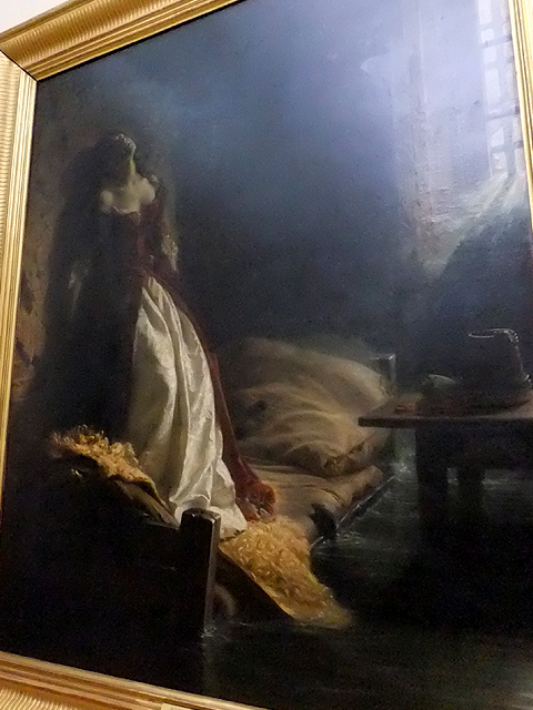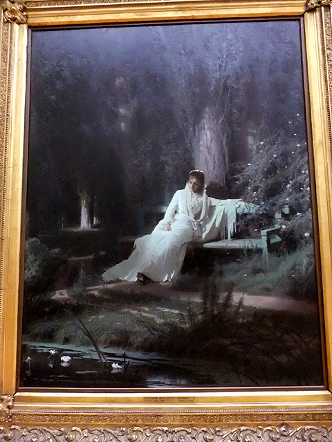 此外,「恐怖伊凡」這特色強烈的沙皇也在各家筆下演譯著,有的以單人肖像呈現枯槁殘酷面容、嚴峻陰鷘眼神,然更多的是描繪他因著猜忌,在盛怒下錯手殺死兒子的悲劇場面。其中一幅兒子屍身癱置於床,沙皇則佝僂縮坐一旁,看似面無表情持著威儀,但抽空眼神與抓緊床單的浮凸指節卻點出其悔恨。其實館內另有張「列賓」作品,卻不知因導遊略去或我亂跑而錯過。在那場景裡,「恐怖伊凡」處於失手殺害的當下,兒子頭顱滲流著鮮血,沙皇則不再倨傲威凜,只是個驚惶無依老者,圓睜著失焦雙眼,擁子顫抖卻無力吶喊。
