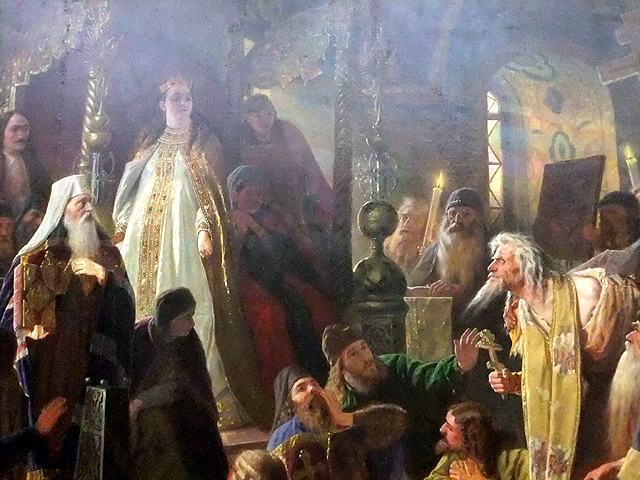 畫中勾繪了審判中的混亂火爆場面,周遭密點人群推擠鼓譟著,被扣按的「Nikita」雖髮亂袍散,依舊昂首朗聲辯駁。與他對語的是高踞王座的「蘇菲亞」公主,她一臉怒容,彷彿下一瞬間便要大聲喝叱:「一派胡言,推出去斬了。」根據史實「Nikita」之後的確身首異處,但公主倒也沒風光多久,「彼得大帝」即位後,她不甘由攝政退回單純皇姐,發動政變失敗被軟禁修道院至死,或許冥冥中濫殺總有報應反噬吧。