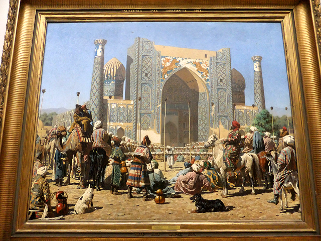 這樣的異國風情也出現在第二十七廳的一批畫作,與歐洲景物迥異,它們以回教建築呈現中亞國度風貌。繪者曾至那兒遊歷,對俄羅斯與當地部族交戰的血腥有感而發,因此儘管畫面看似別致瑰麗,其實卻隱著骨骸殘屍。像其中一幅「They Celebrate」像是以撒馬爾罕標誌建築為主題,雖壁繪殘碎,拱門立柱依舊堂皇霸氣。但若凝神細觀,廣場叢聚的人群間一根根長竿豎立,竿頂卻插著俄羅斯軍人頭顱,讓人望之顫懾。