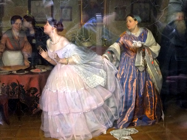 行畢「特列季亞科夫美術館」的前半區域,在後段的第十五廳附近,有許多關於小市民的諷刺作品。其間「Matchmaking of the Major」描繪婚姻中的買賣關係,構圖似舞台上的劇情搬演由右往左流動著,可見到少校於邊側支牆不耐等候媒婆撮談,為了攀附權貴的老富商以諂笑遮掩心中盤算。中側是母親揪住反身逃跑的女兒裙紗,女兒的愁容奔影藉雪白華裝透顯得鮮亮,角落僕從的咬耳私語則為這樁醜事下了不屑註解。