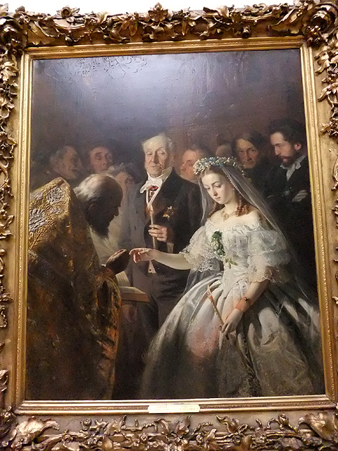 宛如與先前主題呼應,隔了一道牆門又是張大幅繪作「The Unequal Marriage」。在這兒,秀麗新娘垂首抬臂默然任牧師祝福,臉上是被微紅雙眼染黯的哀容。然旁側的乾老新郎卻奸佞著臉,一副憑勢輕鬆翻掌便奪美嬌娘的得意模樣。