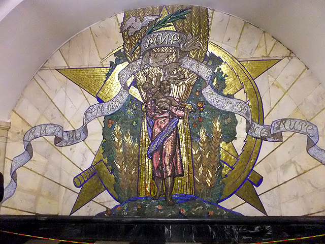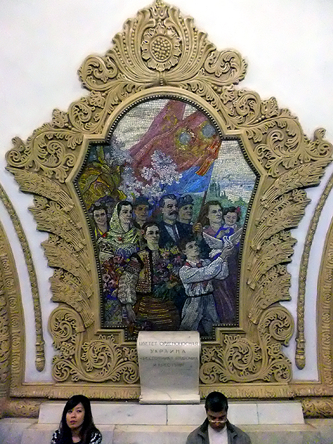 廳尾另外還有片拼畫「Peace Throughout the World」,背景是蘇維埃時期代表性的鐮刀、鐵槌與五芒星,豐收稻穗前則有婦人高舉稚兒,望著翔鴿期許世界和平。照我本來性子,應緩步端視將這些彩畫盡量留印,但旅遊團就是待不得人,放風個五六分,便嚷喊集合準備趕下班進站車。於是我只能奔著瞥看,隨機挑些圖框按下快門再飛速竄回,在各站宛如從軍打仗般持續繃緊神經。