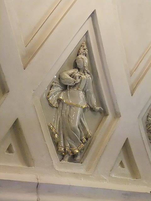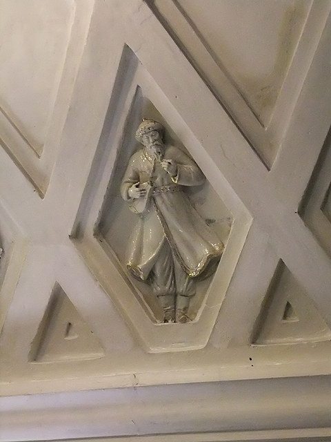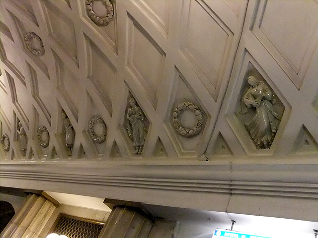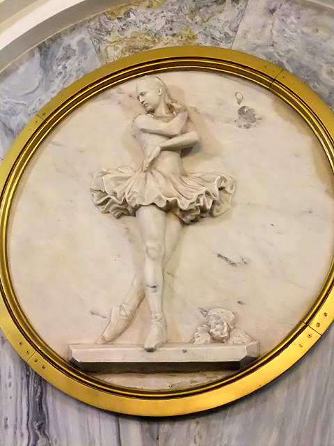 這裡同時亦是地鐵三線的交會點,但附近屬於綠線的「劇院站」(Teatralnaya)卻有著迥異風貌,以槽柱支撐的廳廊色調更顯淡淺,雕鑿之處則在弧頂,它以線條斜切交錯成網格,再用花環略微點綴。但素白之色中隱匿著細緻人像鑲綴,帶著釉亮光澤的勾金陶瓷捏出俄羅斯各族男女,他們身著特色帽冠,有的毛裘厚重,有的巾袍飛揚,在琴樂旋舞中,展現亞美尼亞、白俄羅斯、喬治亞的丰姿,透顯哈薩克、烏克蘭、烏茲別克的熱情。