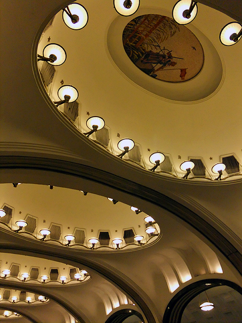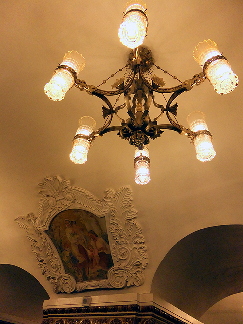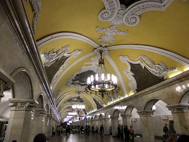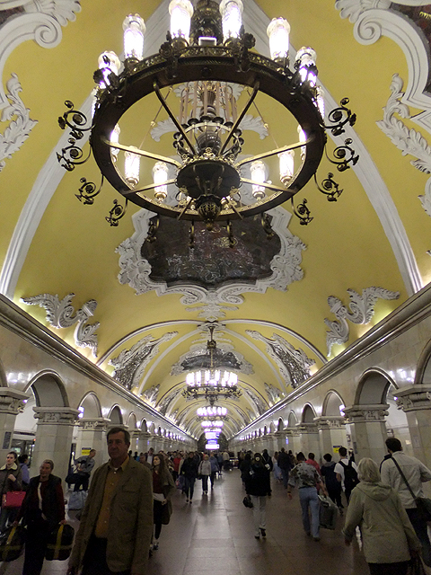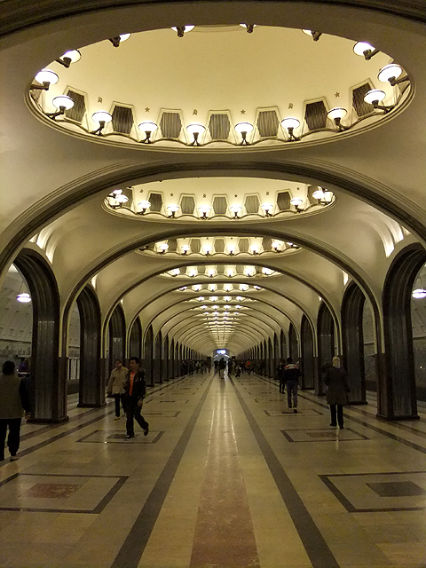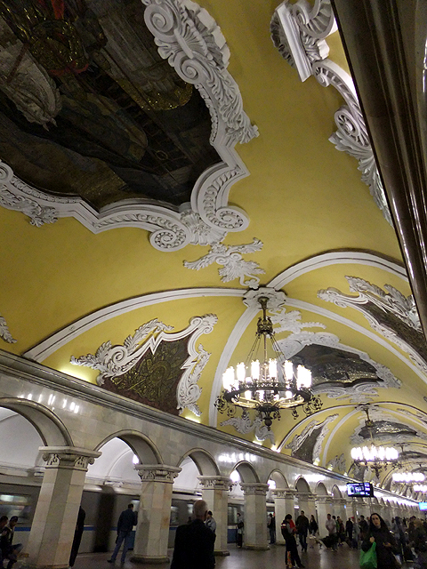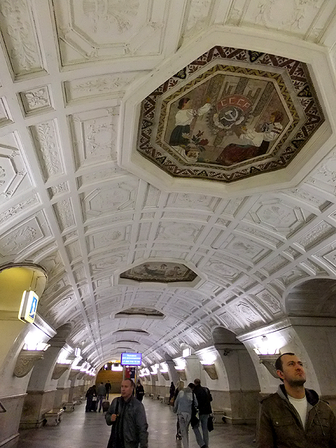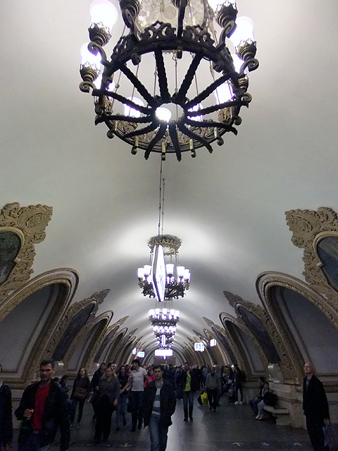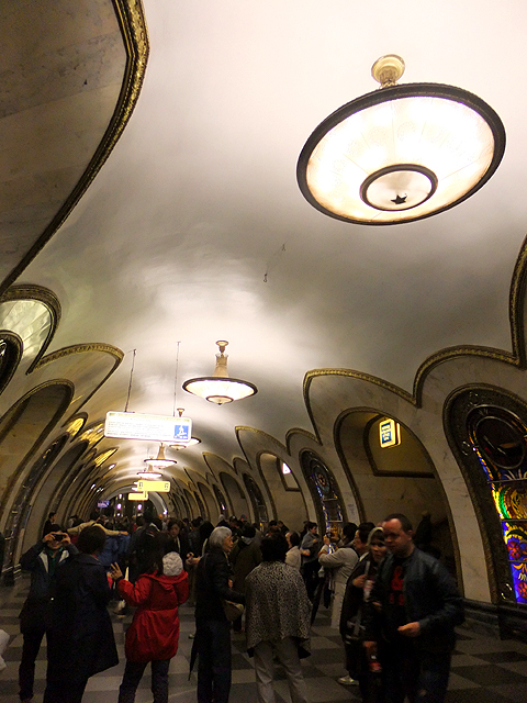 搭車方式跟聖彼得堡那兒大同小異,只是代幣換成了票卡,領隊緊張兮兮深怕哪個人落隊了、走失了,不斷耳提面命各樣要點,然後大夥從拱頂大廳踏入彷彿通抵地心的陡斜電扶梯,新奇地東張西望。不過對我這早於聖彼得堡當過地鼠之人,便只能放空等待。而當踏入月台,等待心情登時轉為興奮,眼前所見果如書本所述宛若地下宮殿的一處廳堂,炫麗往前舖展。