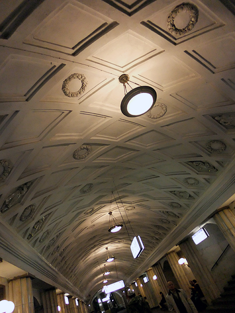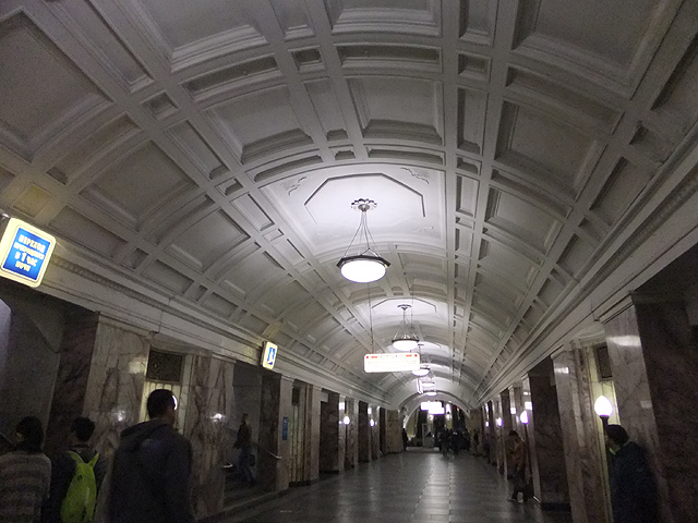 然此月台倒也非重點,僅是為了從這裡轉綠線往北,前往兩站之遙的「馬雅科夫站」(Mayakovskaya)。說來也諷刺,我們投宿的旅館就在外面不遠處,卻大費周章繞了一圈又折回,況且這幾日很顯然我會不斷由此進出,特地轉來這裡根本多餘。不過此站設計在幾次評選都名列前茅,若照原先路線略去,恐也真被人客訴吧。