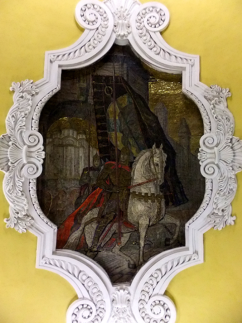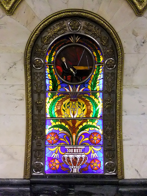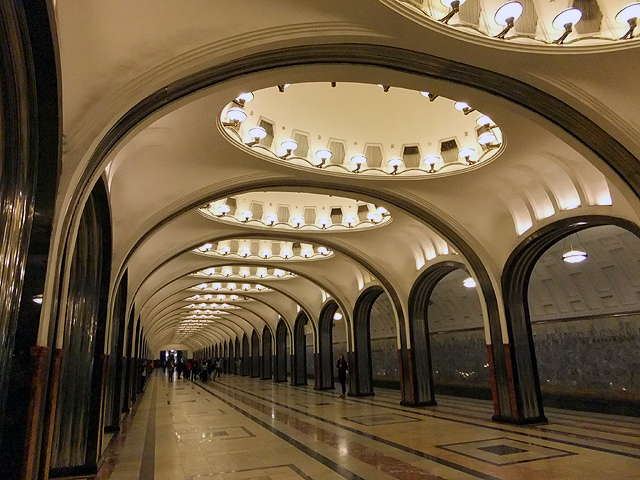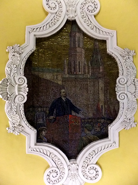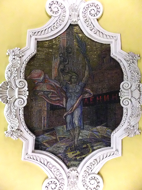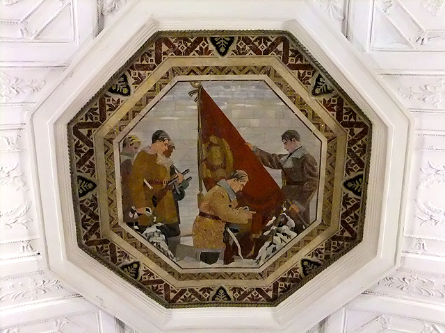 根據資料,設計師靈感來自史達林於二戰間的一場演說,以民族英雄「聖亞歷山大」的圖繪為首,藉歷史著名戰役激勵人心。於是當一路順月台前行,我望見舊時代裡金戈鐵馬奔野、將領威武凱旋。而當時轉近代,有列寧在紅場激昂講演,代表俄國的少女踩踏納粹旗幟、高舉槌鐮與棕櫚枝宣揚國威。撇去政治意涵,每幅皆在炫閃背景間刻烙了時代風情,惹人仰首佇望。