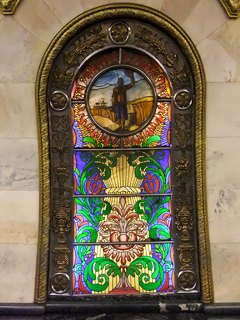 它雖是條筒狀甬道,但兩側挖出一虹一虹的彎拱,而拱柱上是各樣顏彩的玻璃花窗。花窗以黃銅綴邊,有著藤葉帶飾,當中自然是色塊斑斕拼組,花莖扭纏、瓣葉艷翠,烘托著上端的圓框鑲畫。框內有的簡單用弧邊交切成圖騰,有的則以人物為主題。這些馬賽克拼窗在柔煦光源透映下,散著溫潤的耀彩,近看會訝歎其變幻多端的絢麗,遠望又覺拱道成了躍動波流,在彩石灘上歡歌湧捲而過。