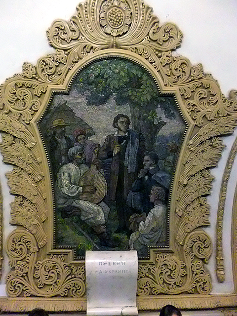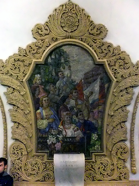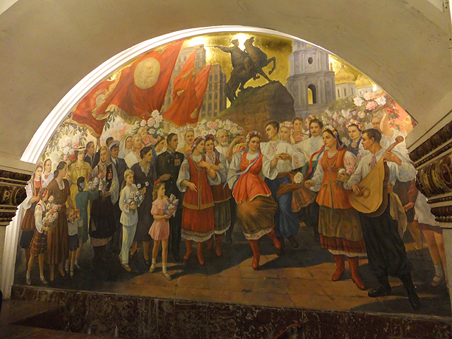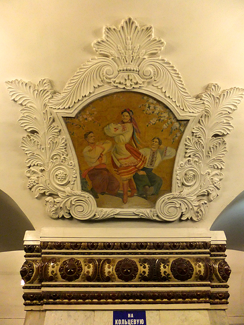 如此走上一遭,我們又再度登上列車,不過這次是反時針而行,數著五次車門合開,來到「基輔站」。此站與通往烏克蘭基輔的火車站相連,也為三線地鐵穿會的交通要樞。位於環線的這月台同樣是條筒狀甬道,但柱身低矮,幾乎成了由柱礎挑起的半圓拱道。而它的妝點在兩側,金邊綴起交連彎拱,與「新村站」有著類似架構,但鑲在彎拱間的並非玻璃花窗,而是馬賽克拼繪。畫框呈五角勾弧,以捲纏藤葉與揚擺稻穗綴連,當中則是各樣突顯烏克蘭特色的人物景畫。這些男女老幼皆穿鮮亮民俗服裝,或戴花冠,或持花束,歡騰著慶賀氛圍。不過也有部分圖繪替作嚴肅主題,能見學者於鄉野中論談、兵士在砲火間戒備,或許勾勒的是當地歷史重要人物。