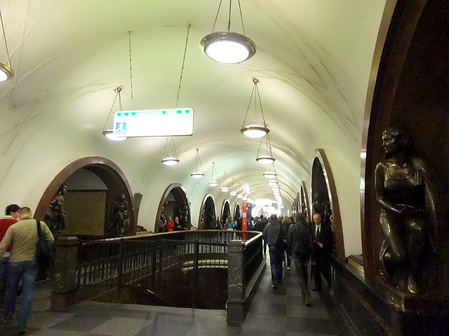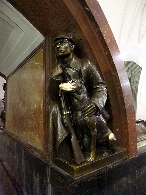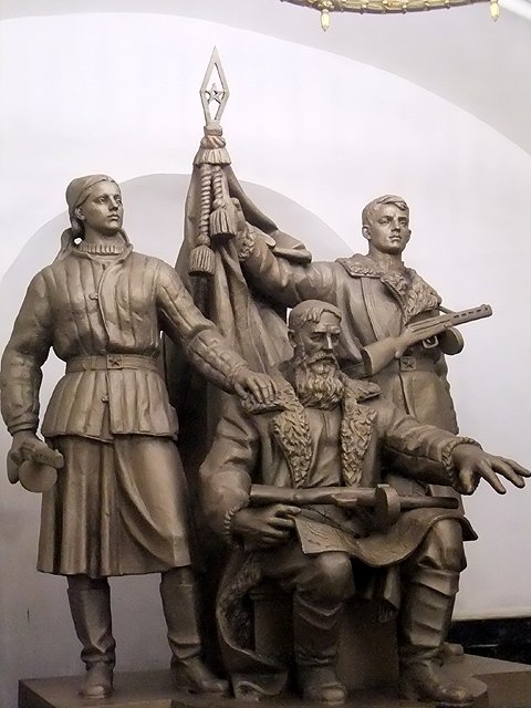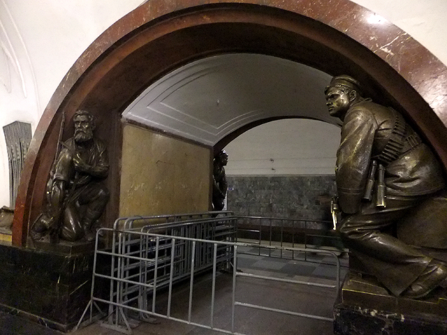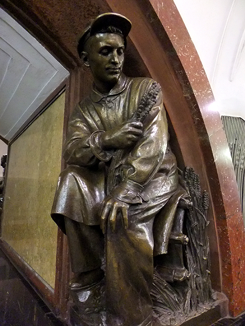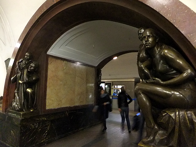 行程簡冊列出的尚有兩站,其一是「革命廣場站」(Ploshchad Revolyutsii),不太記得怎麼過去的,很可能是先繞回「基輔站」再轉深藍線往市心,第三站便是。這兒暗褐弧邊勾著刷白拱道,初見會覺得有點平凡古陳,但每一道拱弧的柱腳都棲附著雕像,若來回穿遊,一尊尊拜訪,也有種趣致。這些雕像展示著蘇聯時期的民生百態,有精壯漢子裸裎身軀專注工程,有斯文書生遠望思索持卷苦讀,可望見農忙中的男女割稻餵雞、逗弄稚兒,自然也能看到青年投身戰爭革命,握著槍砲蟄伏警戒。