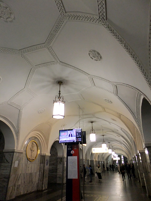 由這兒往北再一站,綠線會與環線再次接軌,這座「白俄羅斯站」(Belorusskaya)由名稱可知頂上有火車直抵白俄羅斯,不過跟能轉往烏克蘭的「基輔站」相較,裝飾風格便平淡許多,赭紅雲紋方柱、方直框格拱頂,僅此而已。