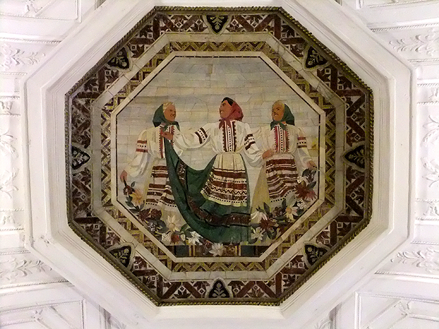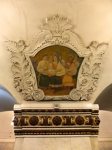 從接駁廊道穿行一小段距離,可以來到位於深藍線的月台。這兒裝飾有著相似風格,但拱頂因列柱拉高而抬昇,鑲畫也隨之置於仰首角度,此外,柱頭圈繞上暗褐的花團飾帶,羽蕨般的畫框則淡淺成雪白,突顯當中的一幅幅馬賽克彩畫。這裡勾繪的主題少了點政治渲染,主要著墨在烏克蘭的民家生活,因此能看到人們攜手於花間漫步笑語,亦或抱著三角琴腹的巴拉萊卡琴撩撥哼歌,自然也有於曲樂中彈旋蹦舞,洋溢著歡鬧氣氛。而廊末另有幅大片半圓拼畫,是民眾持花聚攏、彈琴牽舞,背景則為飛揚紅旗與策馬雕像。資料指稱是慶祝俄羅斯與烏克蘭統一三百週年,然近年克里米亞事件沸沸揚揚,這幅賀圖或也成了諷刺吧。