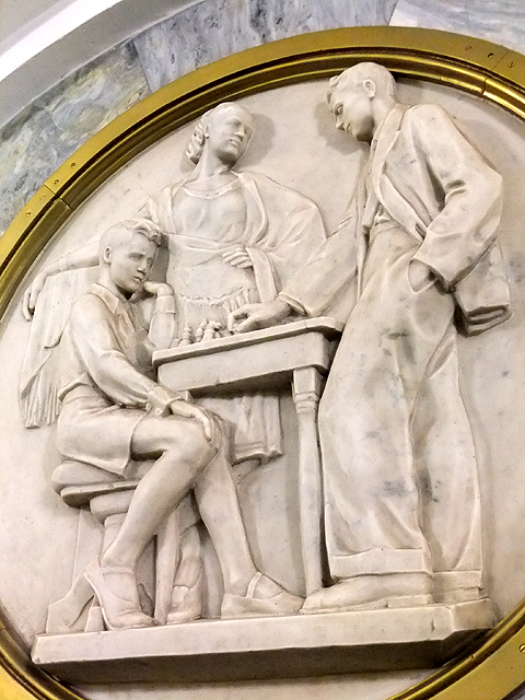 於「基輔站」兩月台瀏覽片刻,我們又循原路倒回,繼續逆時針搭乘環線,但才發愣須臾,便被領著在接續的「文化公園站」(Park Kultury)下車。而一踏上月台,前方景觀頗讓人疑惑,畢竟前幾站皆斑斕地讓人無法移目,此處拱廊卻素白清簡,有著極大反差。柱壁爬帶大理石雲紋,拱頂框切成蜂巢狀,略有雕鑿的僅為牆上的低調雪色浮雕,刻著蘇維埃時期的青年男女,以下棋、琴鼓、芭蕾舞之類的活動,呈現當時的運動休閒。我一面隨意瞥看,一面竟發現導遊正領著我們從手扶梯往外行出。