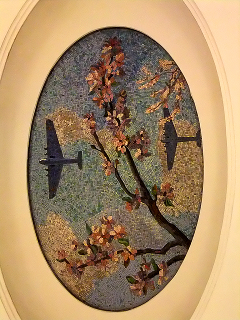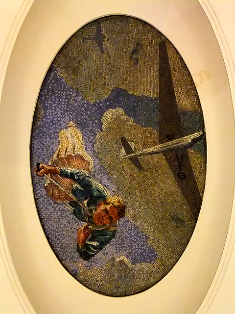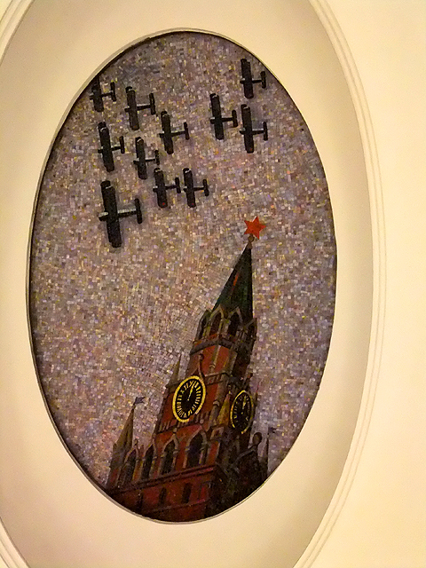 此時便覺裝飾不必繁麗撩目,有時單單幾筆線條勾畫,就能賦予躍動靈魂,引人共鳴。不過此站設計不僅於此,當行於環燈凹穴之下,每處都自成天窗,在頂部以馬賽克鑲畫拼出景緻,呈現俄國詩人「馬雅科夫」眼中的未來。故而一路走著,就像看望地鐵外隨四季轉變,雖戰機飛掠紅場尖塔添了些冷酷,但春華粉艷、秋實纍纍,淨白羽翼揚舞的天際著實惹人佇望。