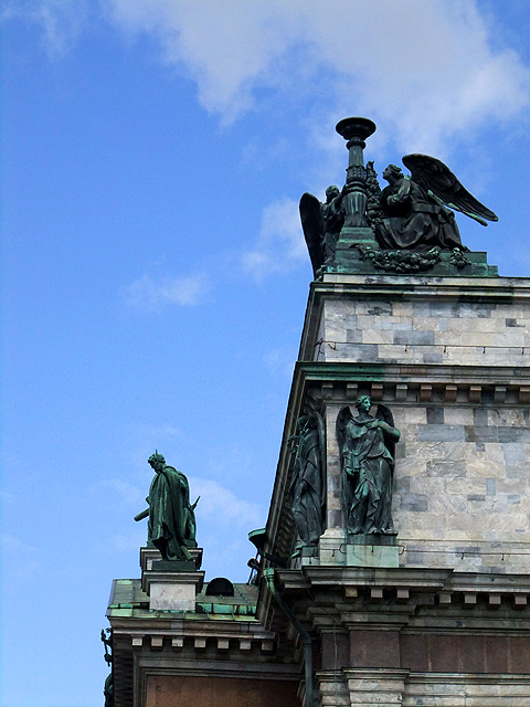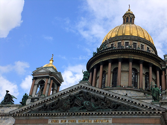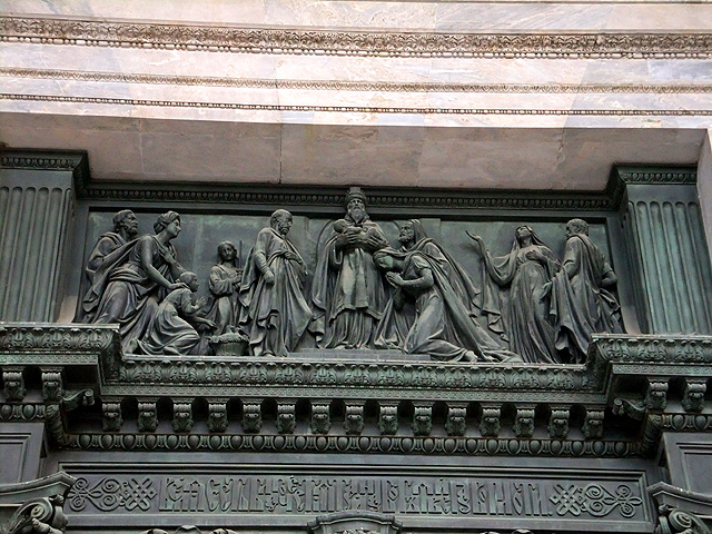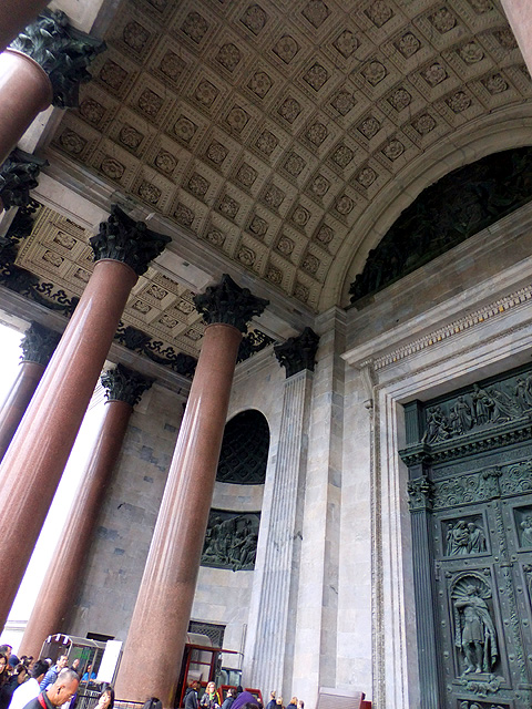 然大夥隨意拍完照後,視線又轉回了教堂。其外形看不出東正教元素,採用的是很工整的新古典主義風格,正中為燦亮拱頂,四面則皆有希臘神廟的山門柱廊。教堂名稱緣由自達爾馬提亞的聖以撒(Saint Isaac of Dalmatia),他放言對抗羅馬皇帝對基督教的迫害,故而被囚入獄,直到「狄奧多西一世」繼位才被釋出。在東西側的門廊三角楣,能見到相關刻繪,當中的「狄奧多西一世」夫妻彎腰垂首,「聖以薩」手持十字架抬臂祝福,細膩鬚袍間透著誠敬與莊嚴。