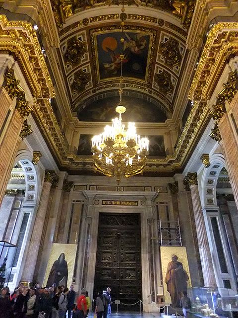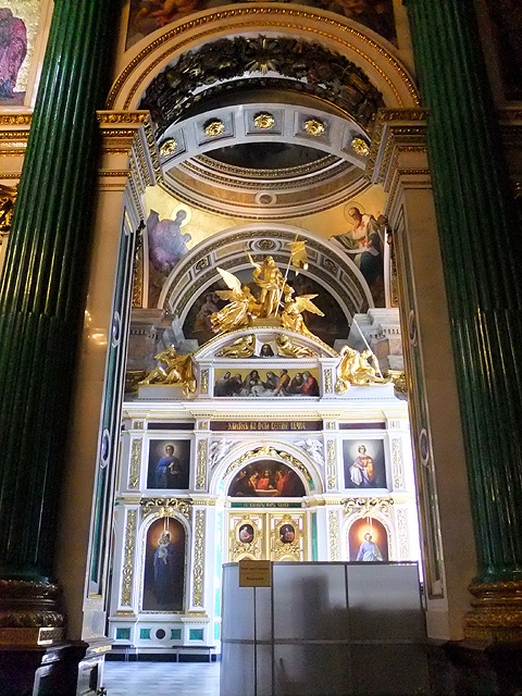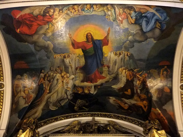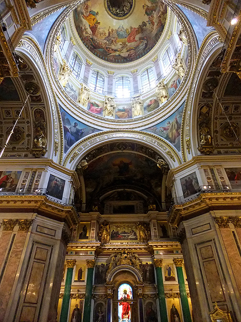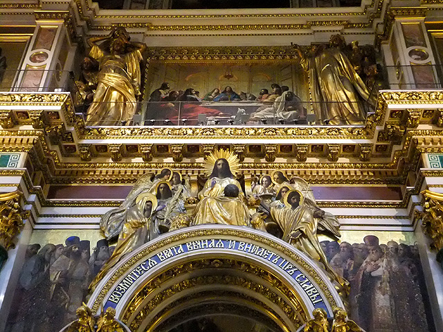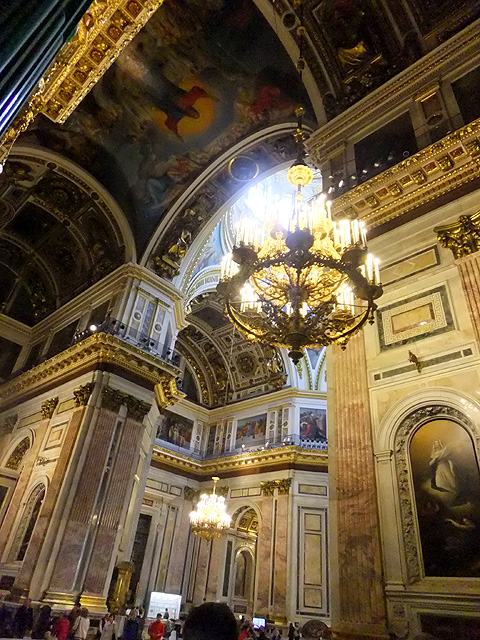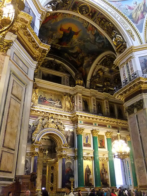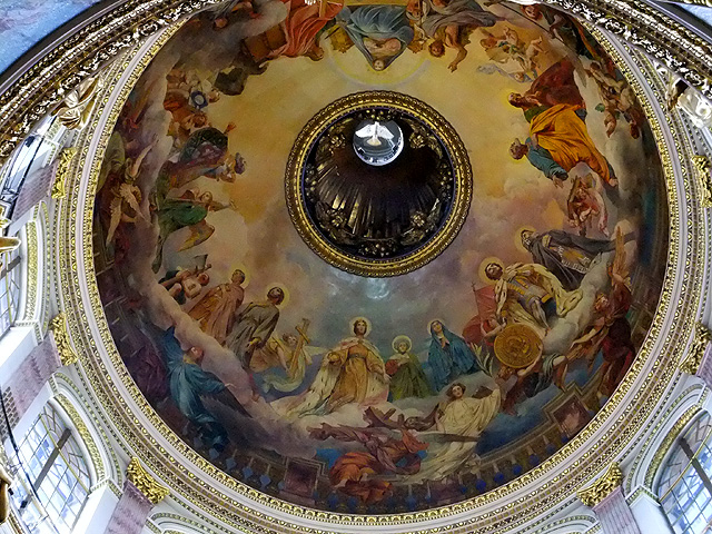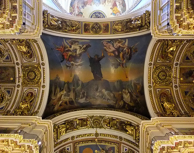 我走至拱頂下四面抬望,若暗晦的「喀山大教堂」透的是走過歷史陳傷的沉靜,精巧的「滴血大教堂」顯的為帶著諷刺血艷的繁麗,眼前這「聖以薩大教堂」便是以光耀高廣空間接迎訪者,素淨之壁為凡界,勉人心境空澄,華彩之頂是天堂,讓人靈神嚮往。在頂上光源投入處,壁面用燦金天使雕像和使徒彩畫相間搭襯,環窗之上的拱頂是聖者林立雲端仰望聖母瑪利亞,正心則為象徵聖靈的白鴿展翅翱翔。