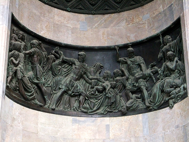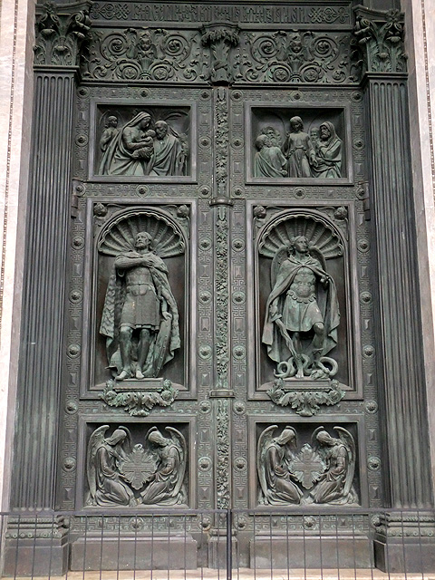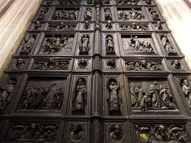 我一路隨導遊踏上台階,門廊初看格局簡潔,但其實也有雕琢。拱頂以圖騰鑲板拼飾,兩側壁龕綴著橫幅浮刻,雖查不到資料說明主題,但圖繪裡紛亂軍士搶奪婦人懷中稚兒,天使飛臨傳達耶和華旨意予老者,感覺似是「出埃及記」中的故事,但服裝卻不像,頗令人疑惑。正中銅門亦同樣有精微刻鑿,板面挖出龕室又浮透人像,周遭再添上飾帶與敘事橫楣,不知需多少工夫心神才能有這樣作品。