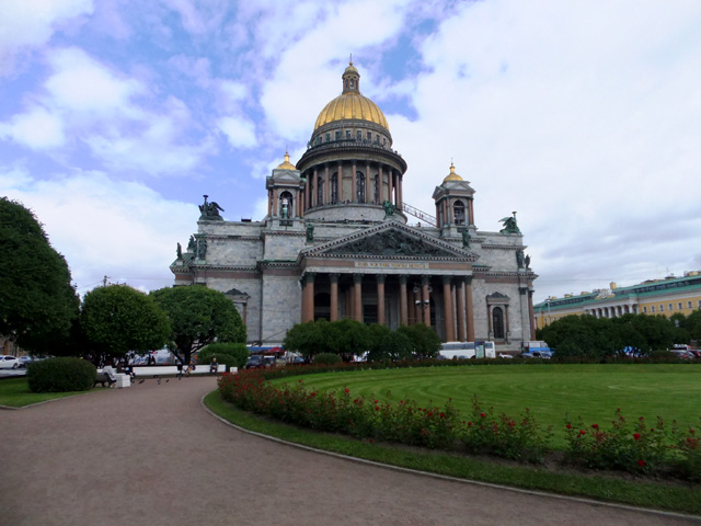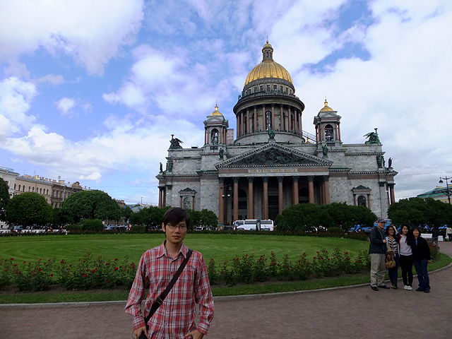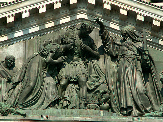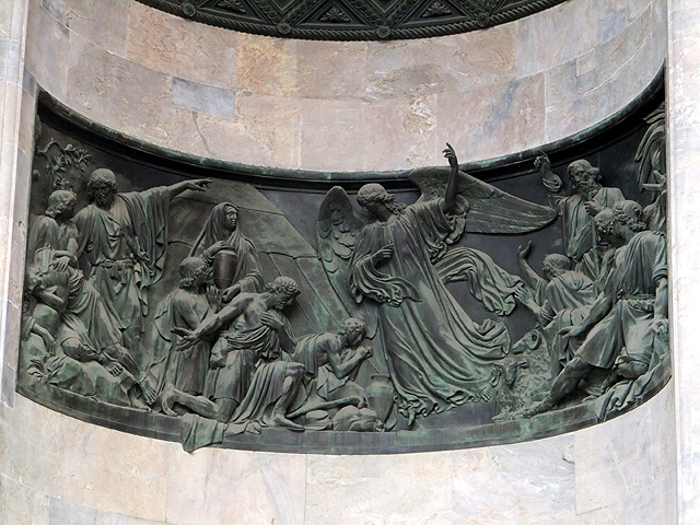 走出了「滴血大教堂」,但與耶穌的對話仍未終止,他招著我穿過涅瓦大街,來到聖彼得堡最雄偉的「聖以薩大教堂」(St. Isaac’s Cathedral)。我們先在附屬廣場下車,於花園裡遠望,這兒有尊「尼古拉一世」騎馬雕像昂立,台座華麗地圈繞上敘事浮刻,並佐以代表美德的四女神,而另一側是贈予他女兒的「瑪琳娜宮」。