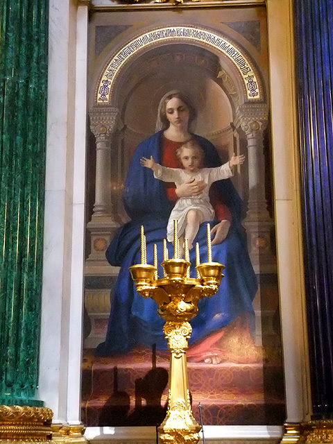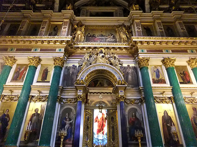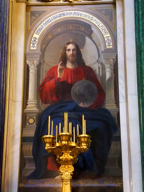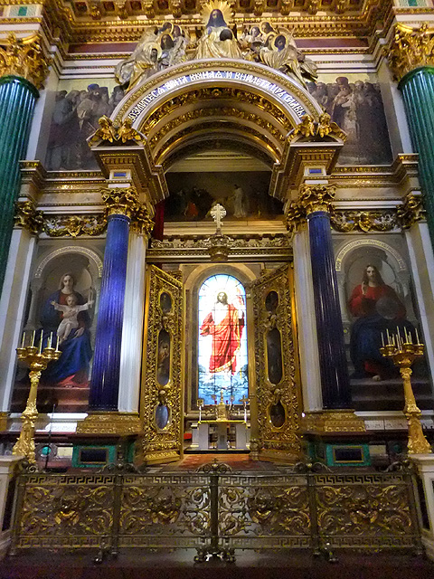 當視線收落,很自然地我起步走向廳末聖像屏,在這兒它不太似隔屏,倒已成座長牆與拱頂無間相接。孔雀石壁柱的碧綠將屏面切分,馬賽克拼組的聖像以燦金為底,秀麗勾繪出基督、聖母子、以及諸位聖者。方才「滴血大教堂」的人像尚揉合了拜占庭時代的風格,筆觸雖已精細寫實,但仍存著扁平構圖與微僵姿態。但此處的卻已包容進浪漫主義的精神,有自然的透視技法和情感強烈的靈動氛圍。