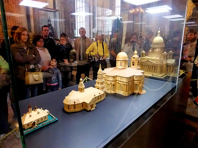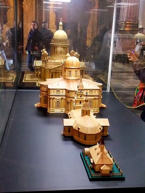 此外,側廊的一處區間還以小模型展示了教堂演變。據說「彼得大帝」因生日與「聖以薩」慶祝日同天,便以此主保聖人為名於涅瓦河畔立了木造小教堂,推測應就是眼前四個模型的最前一座,簡簡單單、小農舍模樣,可惜壽命不長,不到十年便毀於洪水。