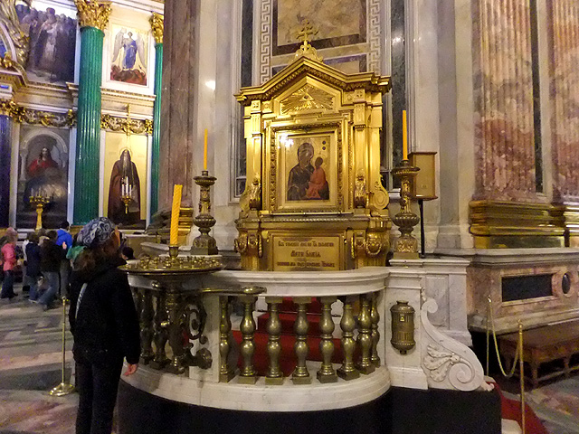 兩邊側廊的屏門與之呼應,有著相似風格,雕花金門、展揚燦頂,僅柱拱低調淨白了些。右屏後的是「聖凱薩琳祭壇」(Side-altar of Saint Catherine),左屏後的為「聖亞歷山大祭壇」(Side-altar of Saint Alexander Nevsky),主畫上面應就是他們的小幅肖像。「聖亞歷山大」這位大公為俄國十三世紀的軍隊統帥,他抵禦了瑞典與德國的入侵、和蒙古勢力週旋,是很受推崇的英雄。不知是否因此典故,此處祭壇倒還維持著功用,有當地人虔敬排隊而後於聖像前祝禱。