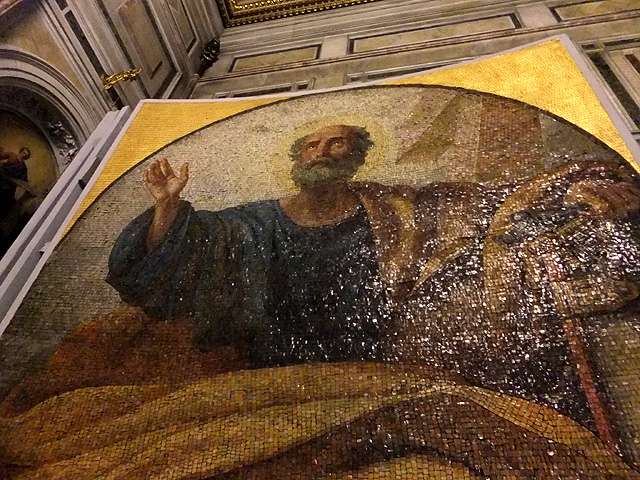 附近有些巨型立板,是教堂馬賽克壁繪的放大臨摹,讓觀者近距離感受碎散色點拼組而成的巧妙。而原先在外行過已覺教堂兩側主門雕鑿細緻,現刻所見的堂內另面卻更加華美。雙排框格內自有襯上背景的組圖,儘管人物密點繁瑣,依舊精微生動。可是這份用心還延展至框邊,它以一個個微型人物龕室拼組,串聯的小圓窗內還有聖者探首外望,這凹凸間的反差距離很令人訝歎。