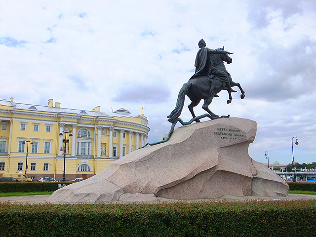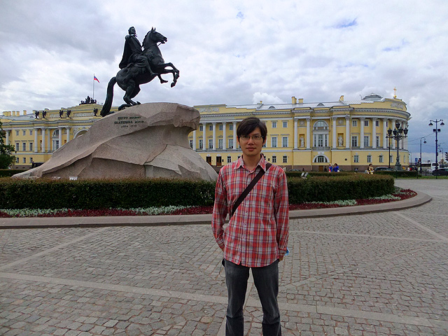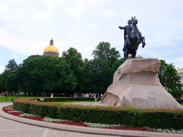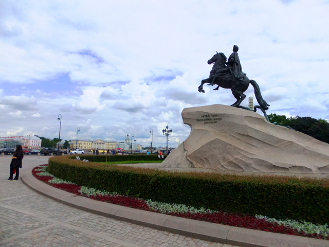 領隊帶我們走出教堂,行至與河岸間的「十二月黨人廣場」(Decembrists’ Square)。這兒是1825年十二月一群軍人針對帝俄政權的起義地點。不過吹起自由風潮的廣場,如今卻被花朵妝點,不少新婚夫婦迎著和煦日光拍著婚紗照。空地中心「彼得大帝」的騎馬雕像也和平相處一起,彷彿歷史幾度的動亂硝煙都成了故事,留存的只是輝煌記憶。
