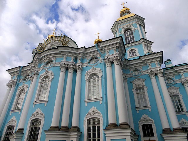 繞著圍籬及林樹,我找到庭院外門穿入,在其身側仰望。教堂是淡藍色調,四角折曲,形成略似十字架的對稱建物。白皙的飾柱三兩地併合妝點,與窗框一同將壁面勾出對比色彩。儘管它有東正教的五塔架構,但其實用上很多巴洛克的裝飾風格。轉角的層次切緣、立面的外探弧面、柱頭窗額的繁複刻綴,都顯現了豐沛的流動感,宛如繁花往枝梢攀繞。而加添於頂簷弧拱的燦金烈芒,更讓其多了黎明時曦光遍灑、生機盎然的明朗意象。