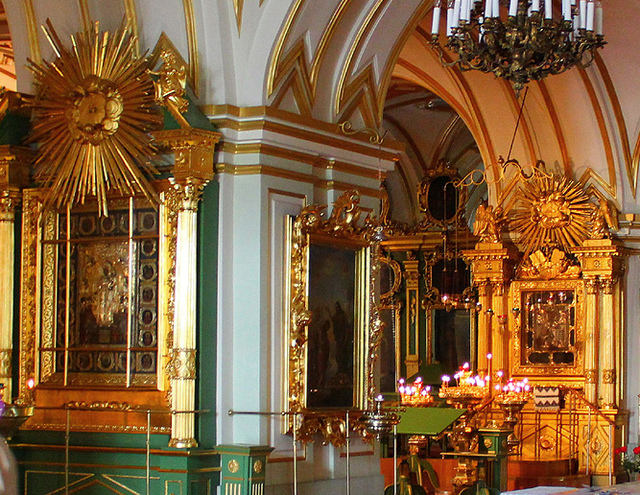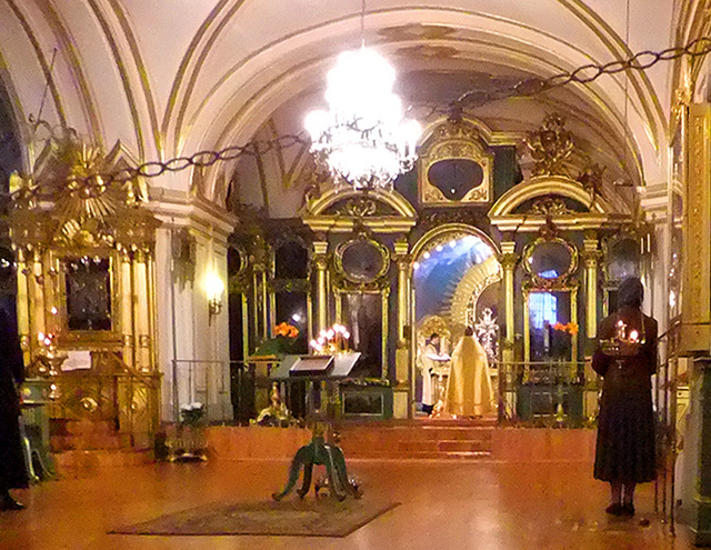 屏頂是銀底金邊的半圓虹弧,當中為醒目搶眼的散射燦耀芒飾,支撐虹弧的灰紋立柱間則鑲上一幅幅華美彩繪。我盯著左手邊的金銀珠鑽鑲畫,猜測應是「喀山聖母」,畢竟不少信徒於前排成長龍。他們陸續走至像前,唇齒開合微動,禱念祈福,並以帶著虔敬的一吻,留下對聖母的感念。